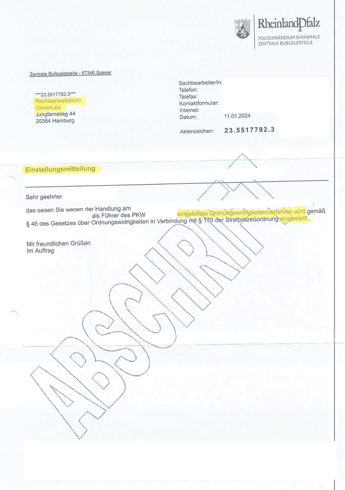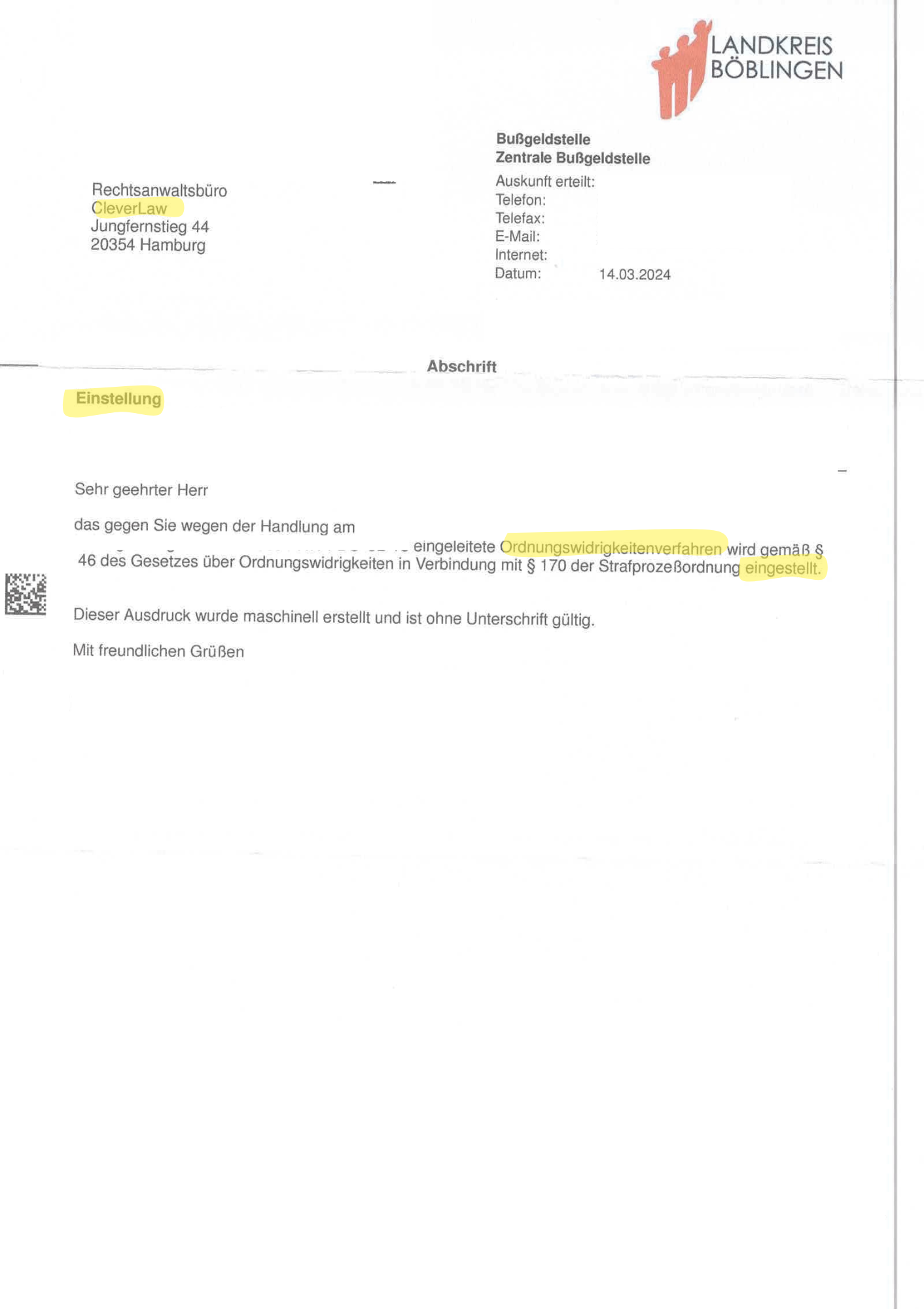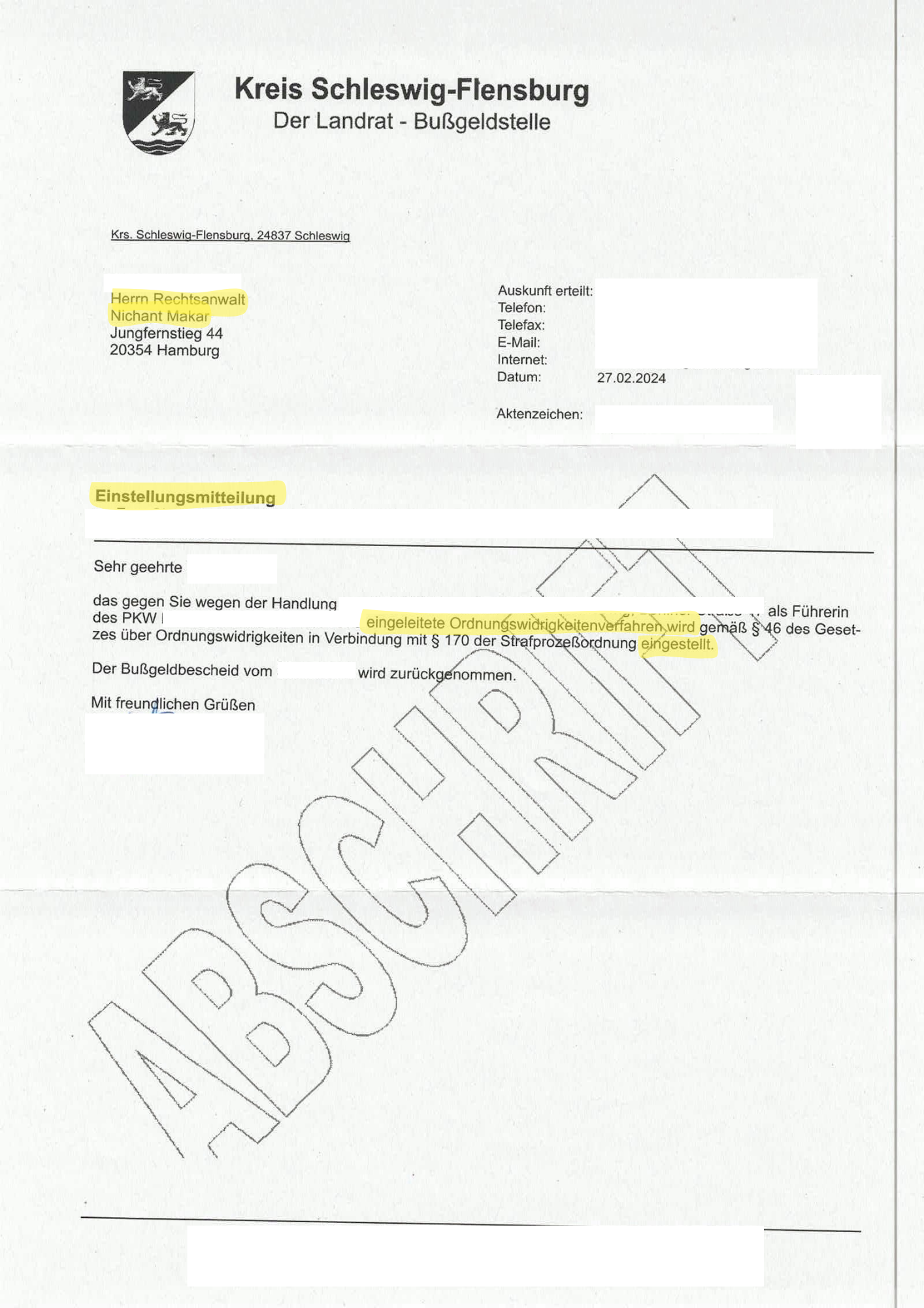 Aktuelle Fälle, in denen uns die Einstellung des Bußgeldverfahrens gelungen ist