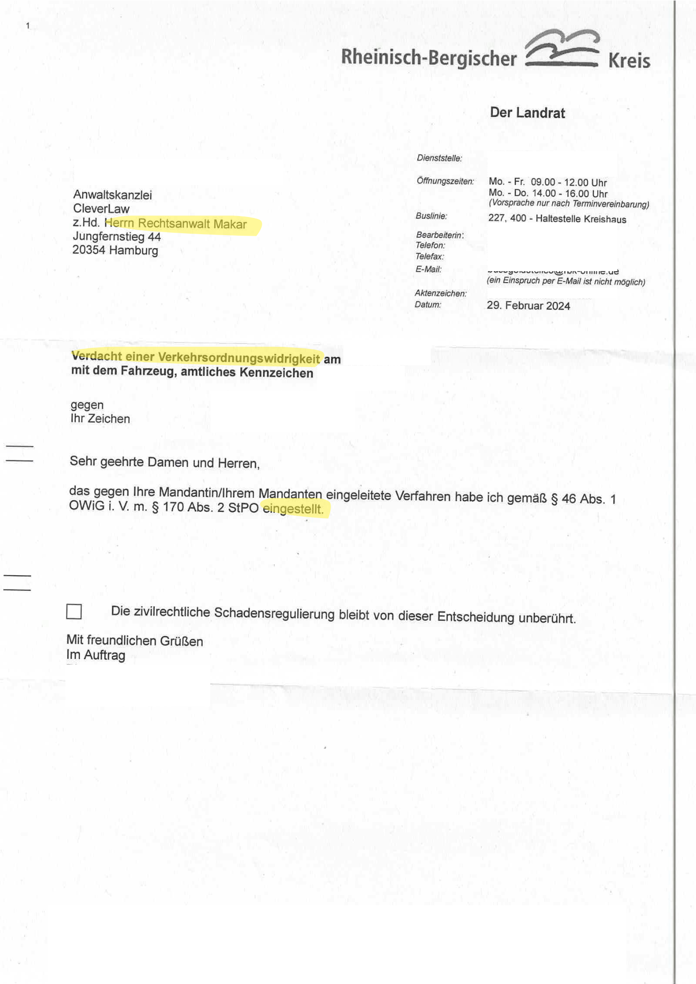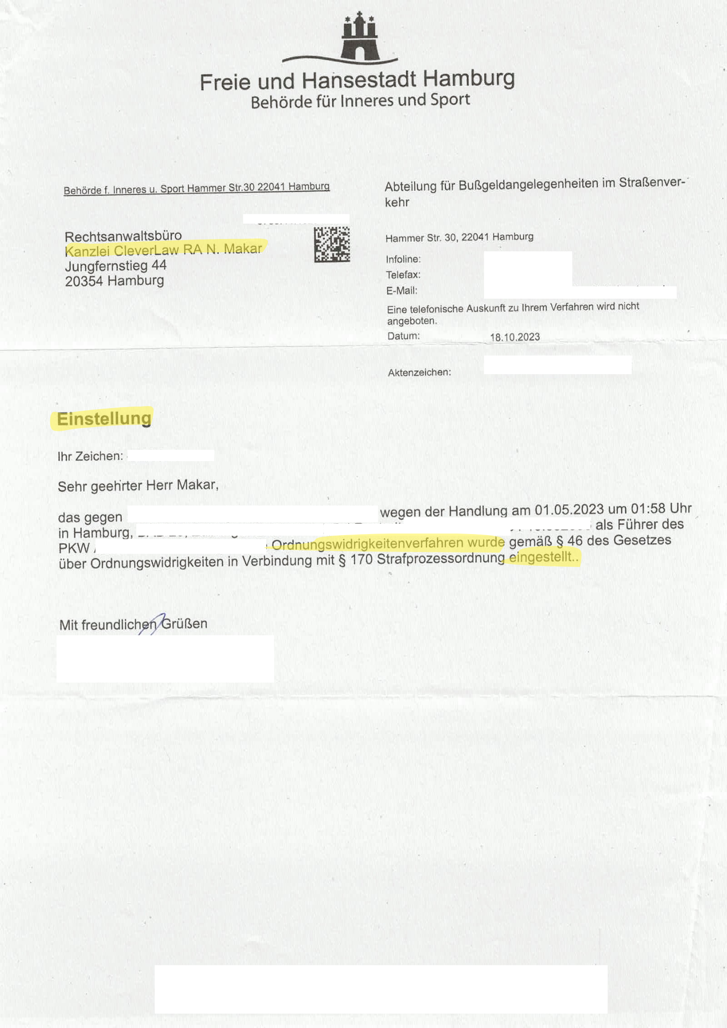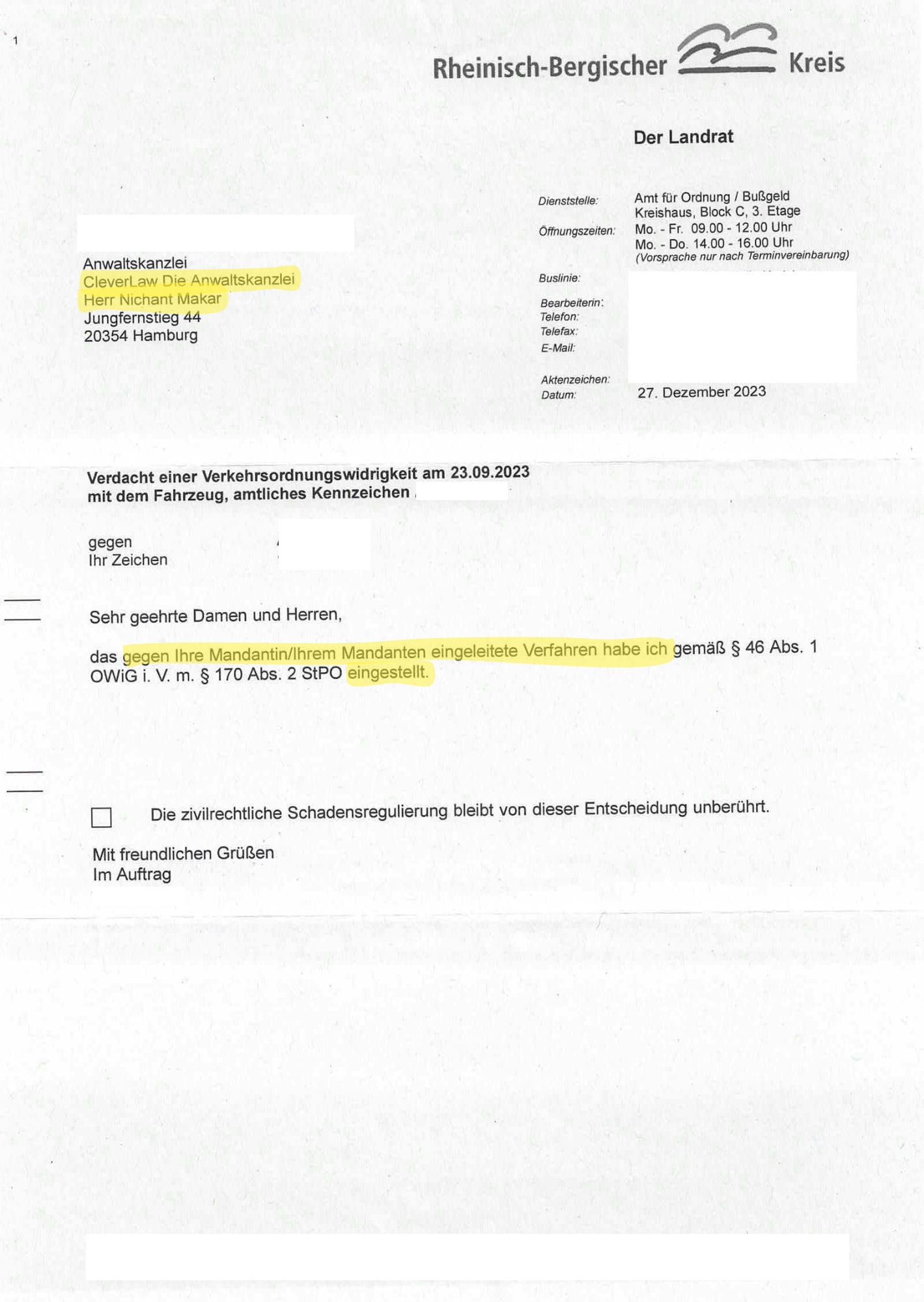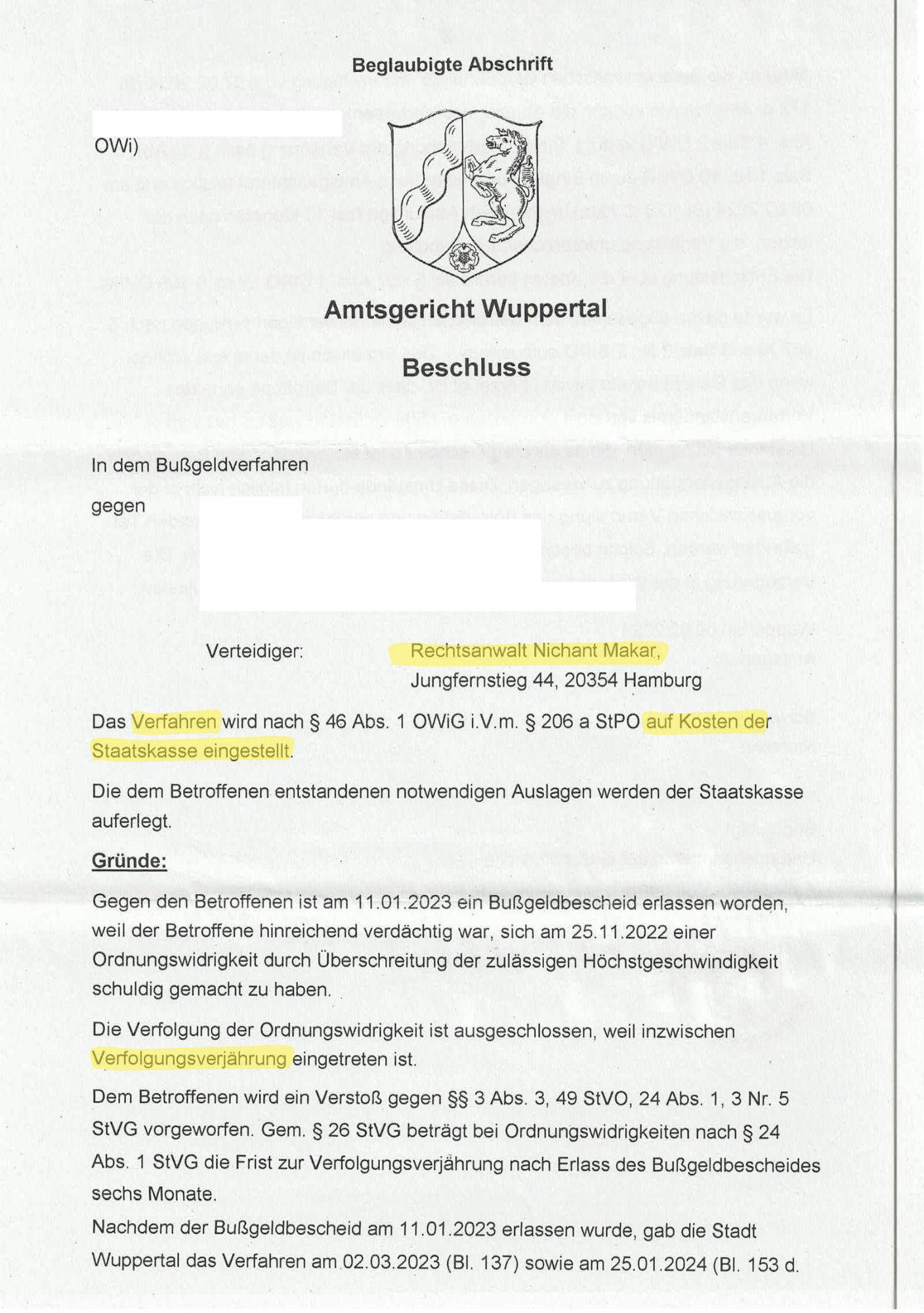 Aktuelle Fälle, in denen uns die Einstellung des Bußgeldverfahrens gelungen ist